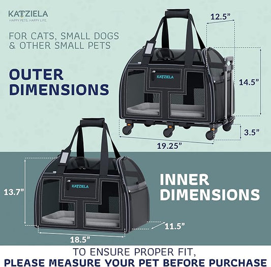 Katziela Rolling Pet Carrier Airline Approved - Pet Carrier with Wheels - Luxury Lorry - Deluxe TSA Approved Cat Carrier with 6 Wheels - Small Airline Approved Dog Carrier Trolley - Plane Carry On Bag