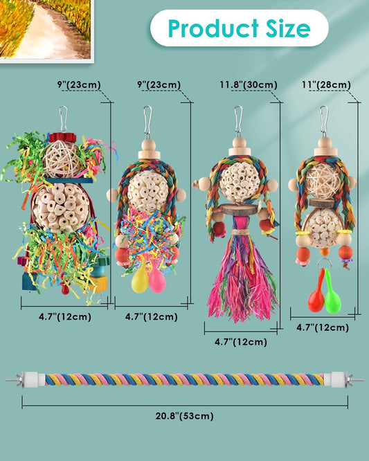 Bissap Conure Toys, 5 PCS Parrot Foraging Shredder Hanging Toys Sola Balls with Sand Hammer Perch Swing Climbing Ladder for Small Parrots Parakeets Conures Cockatiels Love Birds Cage Toy