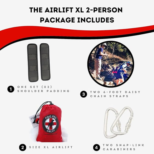 Fido Pro Airlift Emergency Dog Rescue Sling - XL 2 Person Carry System for Extra Large Dogs - Adjustable Shoulder Padding - Lightweight, Packable Dog Sling for Hiking, Skiing - Fits Dogs 70-160 lbs