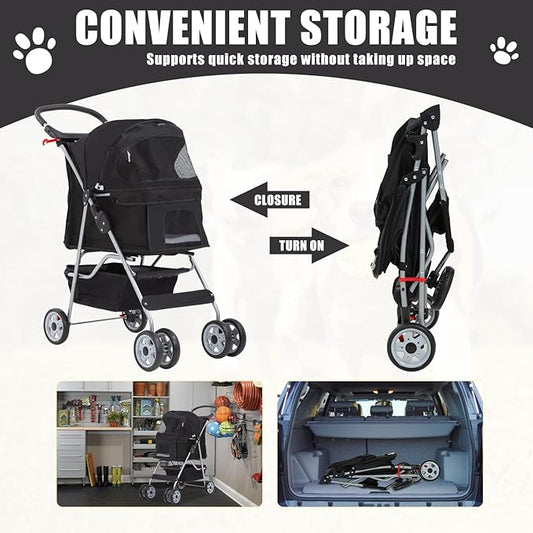 Pet Stroller 4 Wheels Dog Cat Stroller for Small Medium Dogs Cats Foldable Puppy Stroller with Storage Basket and Cup Holder,Black