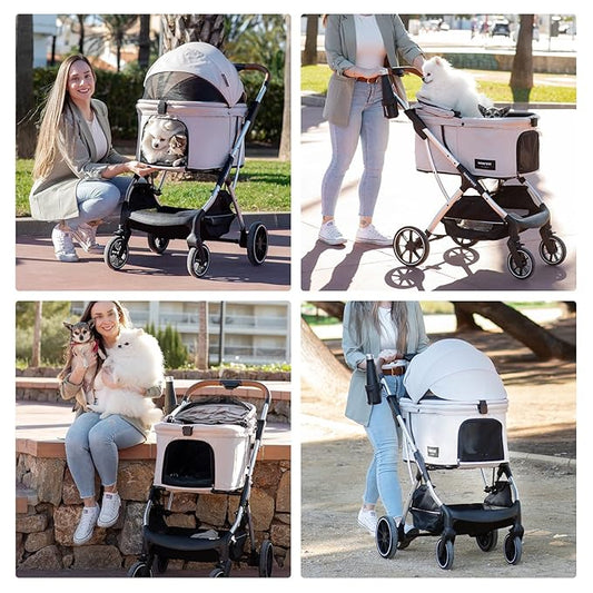 Pet Stroller with 4 Wheels, Foldable Pet Travel Carrier for Small/Medium Dogs Cats up to 50lbs, Detachble Portable Pet Bag, Storage Basket, Car Seat 3 in 1 Multifunctional (Tan)