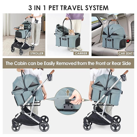 T3 Pro 3-in-1 Small Pet Stroller for Dog & Cats, 4 Wheels with Detachable Carrier with Pad, Canopy and Cup Holder, Green