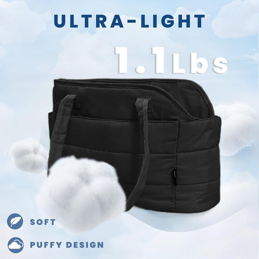 Lightweight Dog Purse Carrier for Small Dogs Under 15 lbs, Puffy Quilted Pet Carrier Tote for Puppies with Safety Leash Clip, Women's Hands-Free Dog Carrier Bag for Travel/Shopping (Black)