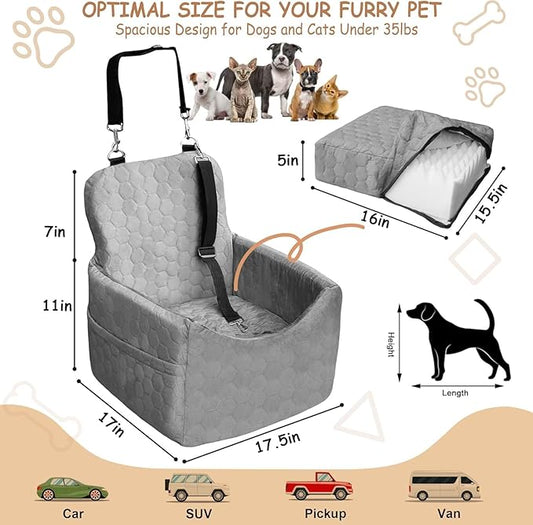 Dog Car Seat for Small Medium Dogs, Memory Foam Dog Booster Seats with Thick Cushion for Dogs Under 35lbs, Detachable Washable Pet Car Seat Travel Bed with Storage Pockets,2 Safety Belt