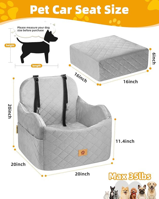 Car Seat Booster for Dog: High-Support Memory Foam Pet Car Seat for Small/Medium Dogs Under 35lbs with Elevated Cushion - Detachable Washable Puppy Travel Bed for Driving with Pockets (Grey)