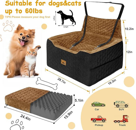 Dog Car Seat for Small/Medium Dogs, Memory Foam Dog Booster Seat, Travel Safety Per Car Seat with Washable Removable Cover, Storage Pockets for Dogs up to 35 lbs(BlackBrown)