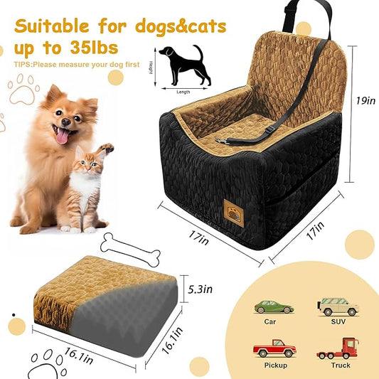 Small Dog Car Seat, Memory Foam Dog Booster Seats with Thick Cushion for Medium Dogs Under 35lbs, Detachable Washable Pet Car Seat Travel Bed with Storage Pockets,2 Safety Belts