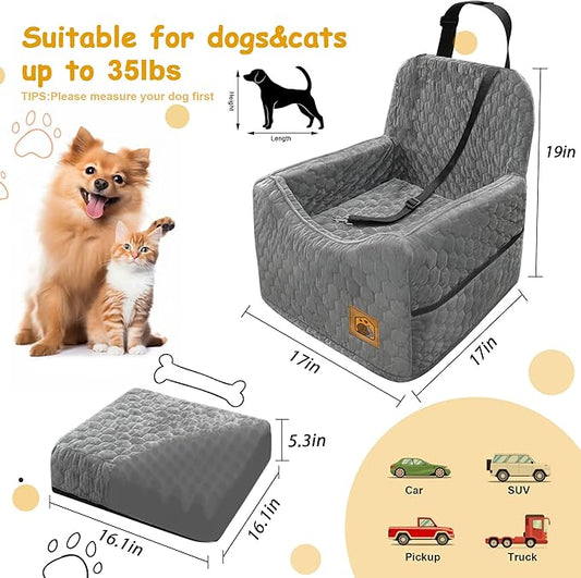 Small Dog Car Seat, Memory Foam Dog Booster Seats with Thick Cushion for Medium Dogs Under 35lbs, Detachable Washable Pet Car Seat Bed with Storage Pockets,2 Safety Belts