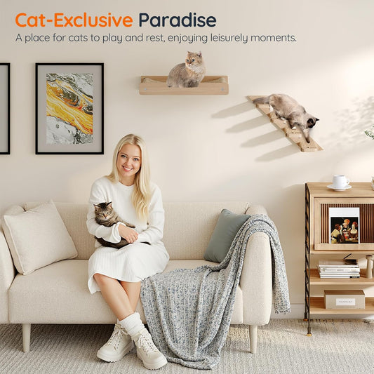 Cat Wall Shelves, Cat Wall Furniture Pine Wooden Feline Shelf, 13 Piece Shelves and Perches with Bowl, Warmer Mat, Condo, House, Steps and Cat Scratcher