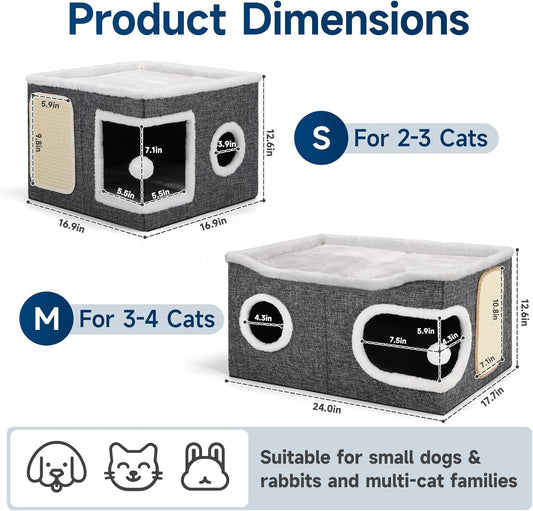 Cat Beds for Indoor Cats, Extra Wide Cat Cube House for Multi Cats, Foldable Cat Cave Hideaway with Arc-Edge Design & Oval Door, Double-Side Soft Cushion for All Seasons, 24"L x 17.7"D x 12.6"H, Grey