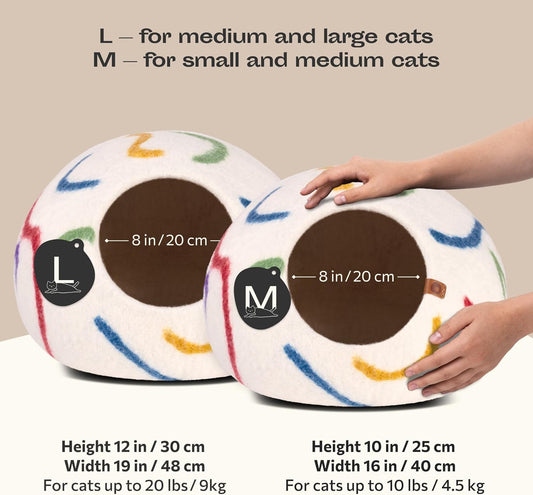 MEOWFIA Cat Cave – Premium Felt Cat Bed for Indoor Cats, Handmade 100% Merino Wool (Medium, Ivory Rainbow)