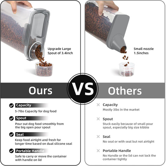 Cat Dog Food Storage Container, Upgraded Large Nozzle BPA-free, 3&5lbs Plastic Pet Food Storage Containers, With 4 Sealed Clasps, 1 Measuring Cup and Handle, Easy to Clean and Carry -Clear Grey 2Pack