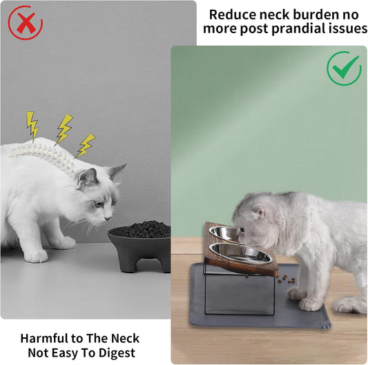 Upgraded Elevated Cat Bowls with Food Mat,15°Tilted Stand Anti Vomiting Raised Cat Dishes for Food and Water,2 Stainless Steel Bowls for Cats and Puppy(Rustic Brown)