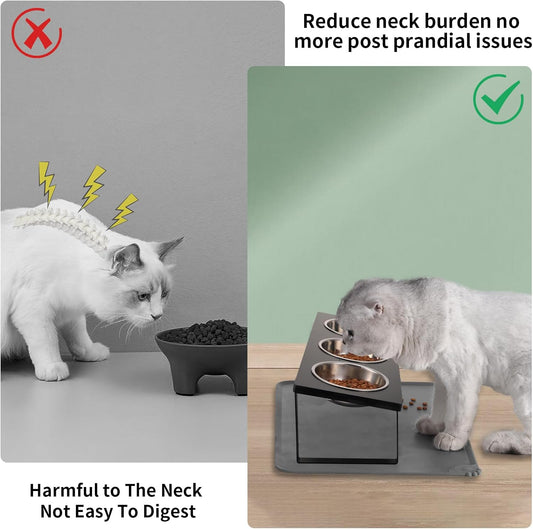 Upgraded Elevated Cat Bowls with Food Mat,15°Tilted Stand Anti Vomiting Raised Cat Dishes for Food and Water,3 Stainless Steel Bowls for Cats and Puppy(Black)