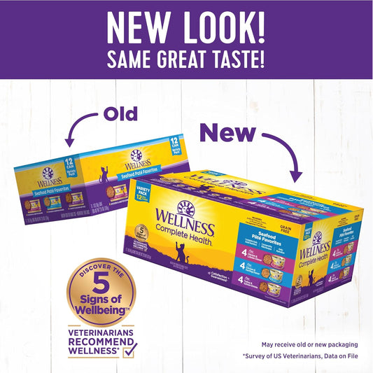 Wellness Complete Health Pate Adult Wet Cat Food, Natural, Protein-Rich, Grain-Free, 3 Ounce, 12 Pack, (Seafood Variety Pack)