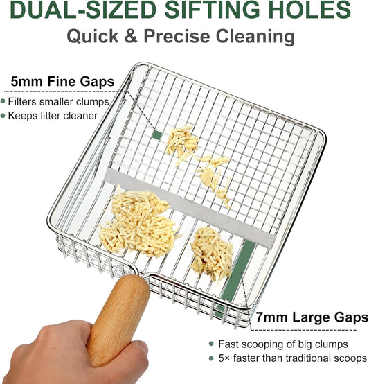 UFECODO Fast Sifting Cat Litter Scoop with Holder Stand, 2 Widths of Slots Stainless Steel Poop Scooper with Ergonomic Wood Handle, Heavy Duty and Easy Clean
