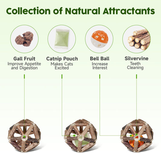 Potaroma Catnip Toys, 3Pcs Cat Toys Natural Silvervine Stick Cage Balls & Bell Ball for Indoor Cats, Kitten Cleaning Teeth Molar Matatabi Cat Chew Toy All Breeds