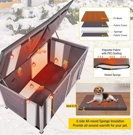 GUTINNEEN Heated Dog House Outdoor with Electric Heating Pad, Insulated Wooden Dog Kennel with 360° Rotating Feeding Bowl, Anti-Chewing Metal Frame, Natural Wood Color
