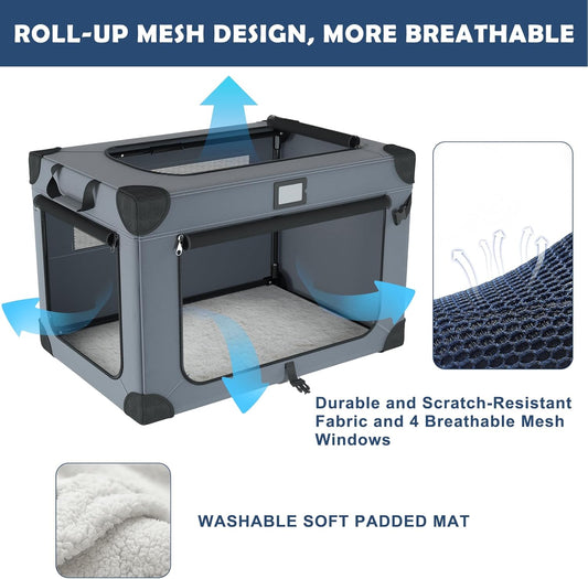 42-Inch Collapsible Travel Dog Crate, Portable 4-Door Soft Kennel for Medium to Large Dogs, Durable Mesh Windows, Indoor/Outdoor Use, Foldable, with Storage Bag (Grey)