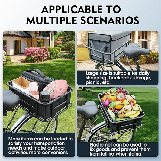Heavy Duty Rear Bike Basket for Adults, Bicycle Cargo Basket with Removable Liner, Waterproof Cover & Cargo Net, Universal Fit for E-Bike, Mountain Bike, Dog Carrier