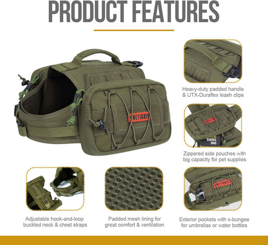 OneTigris Dog Backpack for Medium & Large Dogs, Nylon Backpack for Dogs Tactical Pet Backpack with Side Pockets for Hiking Walking Training Running (Green, Large)