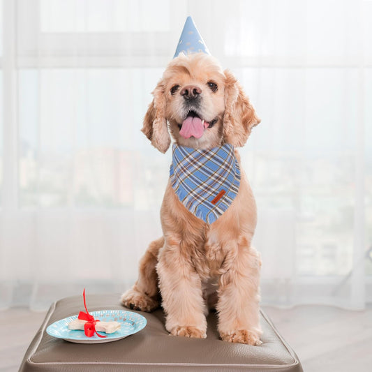 ADOGGYGO Dog Bandanas Boy with Tassels Edges, Stylish Blue Plaid Pet Scarf, Soft Cotton Fabric, Adjustable Reversible Plaid Bandanas for Small Dogs (Small)