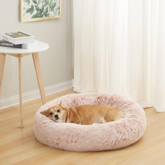 Bedfolks Calming Donut Dog Bed, 30 Inches Round Fluffy Dog Beds for Medium Dogs, Anti-Anxiety Plush Dog Bed, Machine Washable Pet Bed (Pink, Medium)