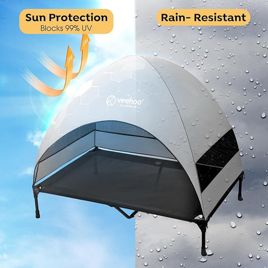 Veehoo Outdoor Dog Bed with Canopy, Cooling Elevated Pet Cot with Removable Shade, Non-Slip Feet, Raised Dog Cot for Large Dogs, Pet Tent Bed for Camping, Beach, XLarge, Black + Grey, CWC2411