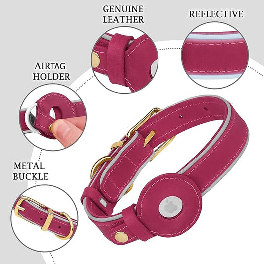 OOPSDOGGY Reflective Geniune Leather Airtag Dog Collar Soft Padded Collars for Small Medium Large Breed Dogs Puppy, 4 Sizes, 7 Colors (Pink, XLarge, 19"-24")