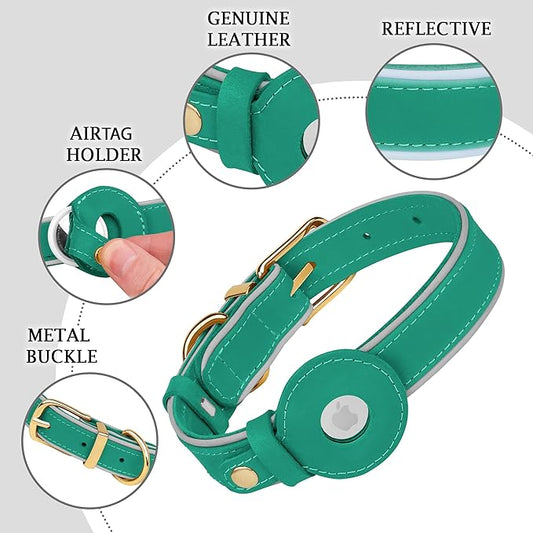 OOPSDOGGY Reflective Geniune Leather Airtag Dog Collar Soft Padded Collars for Small Medium Large Breed Dogs Puppy, 4 Sizes, 7 Colors (Green, XLarge, 19"-24")