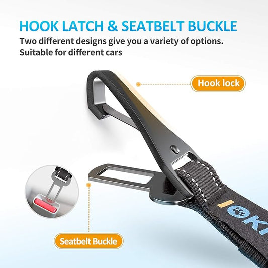 Dog Seat Belt 3-in-1 Car Harness for Dogs Adjustable Safety Seatbelt for Car Nylon Reflective Bungee Fabric Dog Car Harness with Clip Hook Latch & Buckle, Swivel Zinc Alloy Carabiner (Black)
