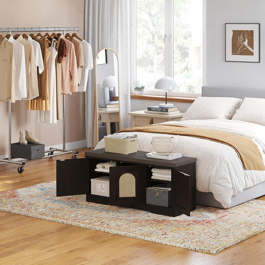 DINZI LVJ Shoe Bench, Entryway Storage Bench with Doors, Cushion, 2-Tier Shoe Rack with 6-Cubby, 39.4”L x 13.8”W Shoe Organizer Cabinet, Adjustable Shelf, Living Room, Bedroom, Espresso with Rattan