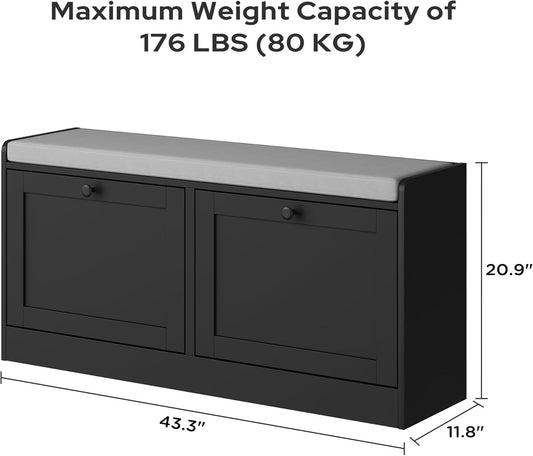 MHOM Black Modern Entryway Bench with 2 Flip Drawers, Shoe Bench with Padded Seat Cushion, Wooden Storage Bench for Bedroom and Apartment