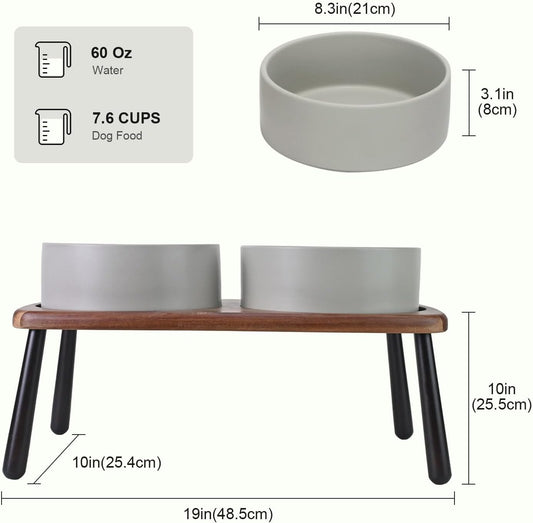 SPUNKYJUNKY Ceramic Elevated Dog Bowls Raised with Acacia Bamboo Wooden Stand, 8.3'' Dog Food Water Bowls Set Non-Slip for Medium Large Sized Breed Microwave Dishwasher Safe - 60 OZ,Grey