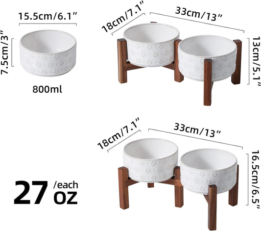 6.1inch Ceramic Raised Double Bowls Set with Acacia Wood Stand, 2 Heights Elevated, Food & Water Bowls for Small Breed Dogs, Weighted Dog Dishes, Pet Bowl(27oz, Arctic White)