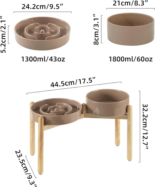 Ceramic Raised Slow Feeder Dog Bowl Set, Elevated 8.2inch Bowl and 9.5inch Puzzle Slow Food Dish with Wooden Stand for Large Dog, Anti-Gulping (2X Brown Coffee+ Stand)