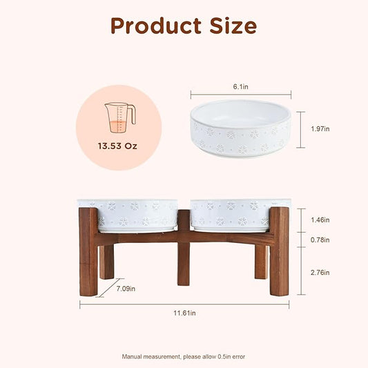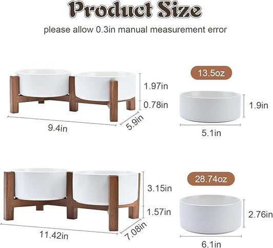 SPUNKYJUNKY Ceramic Elevated Dog Bowl Set with Acacia Wood Stand for Food and Water for Cat and Small Dog (13.52 OZ, White and Reddish Brown)