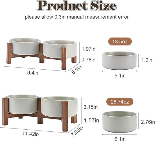 SPUNKYJUNKY Ceramic Dog Bowls with Acacia Wood Stand - Raised Dog Food and Water Bowl Set for Medium Dogs (28.74 OZ, Gray)