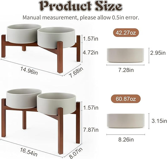 SPUNKYJUNKY Raised Ceramic Dog Bowls Set with Non-Slip Acacia Wood Stand for Medium Sized Dog(42.27 OZ, Gray)