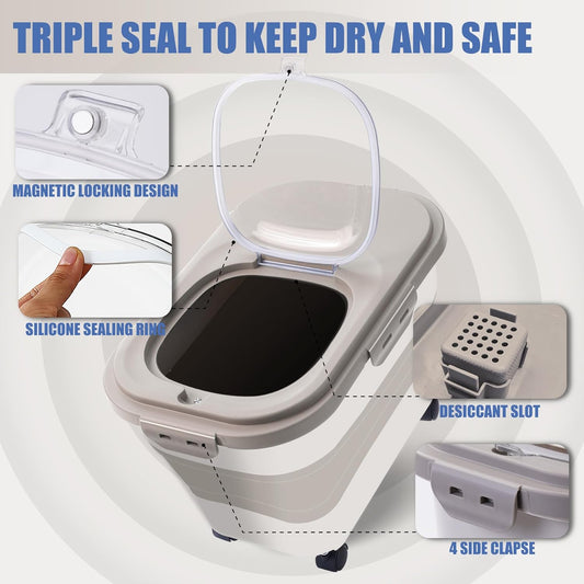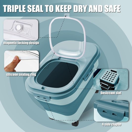 Collapsible Dog Food Storage Container with Lids, Airtight Rice Flour Cereal Sugar Cat Pet Bird Seed Containers Dispenser Bin Bucket with Rolling Wheel, 20 25 30 Lbs Plastic Sealable Kitchen Holder