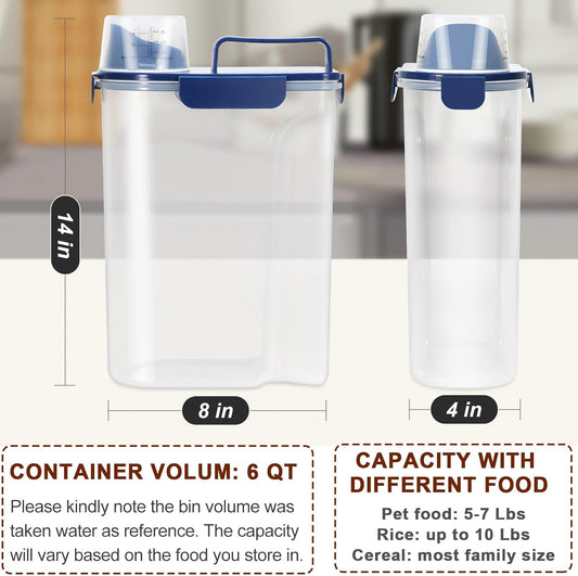Dog Food Storage Container, 5-7 Lbs Airtight Pet Food Container, Cat food Container Dispenser with Portable Handle, Pouring Spout and a Collapsible bowl for Dogs Cats Navy Blue/6Qt