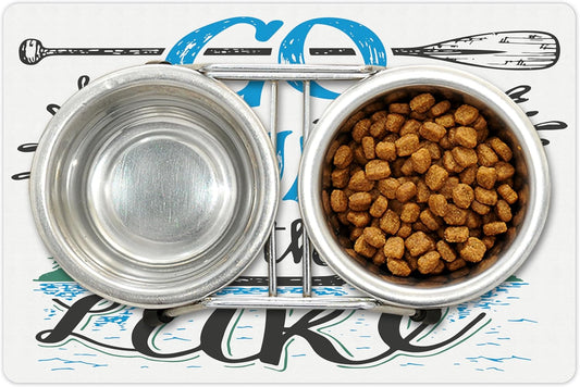 Lunarable Cabin Pet Mat for Food and Water, Vintage Typography Inspirational Words Lake Sign Canoe Fishing Sports Theme, Non-Slip Rubber Mat for Dogs and Cats, 18" X 12", Black Green