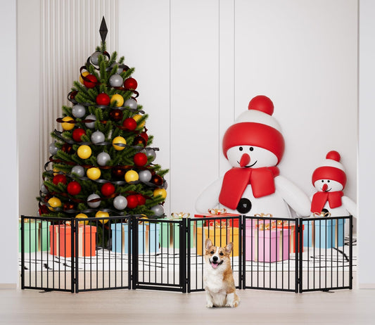Full Metal Freestanding Dog Gate with Door, 32''Height Foldable Pet Dog Fence for Indoor & Outdoor, 6 Panels Extra Wide Free Standing TallDog Gates for Doorways,House,Stairs,Porch,Deck,Yard