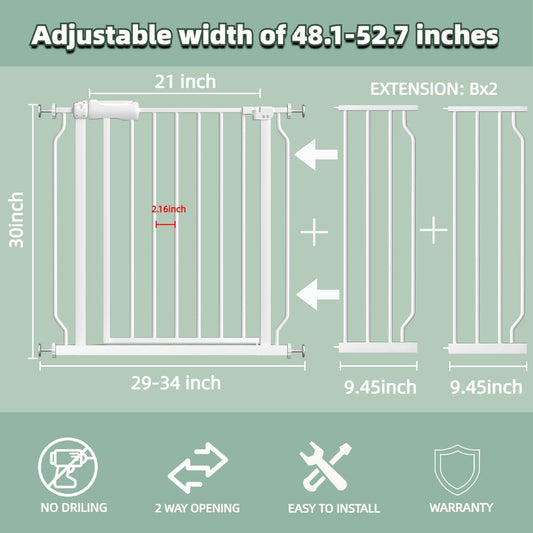 Extra Wide Baby Gate for Doorways 29.9"-53.1", Pressure Mounted Dog Gates With Door, Child Safety Barrier Walk Thru Indoor, Large Babygate Long for Kids Toddler Pet Outside, 30 In Tall White