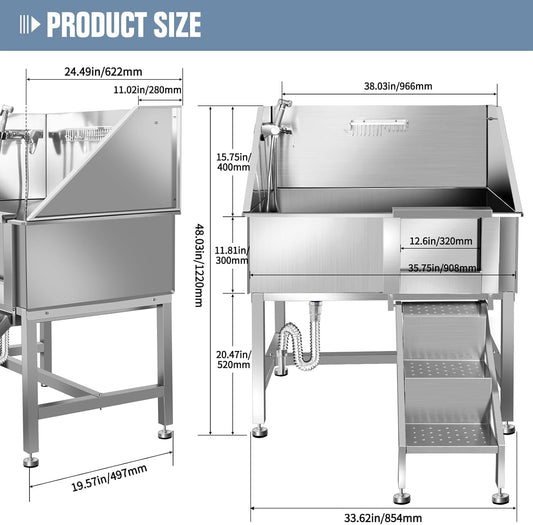 38"" Pet Dog Bathing Station W/Ramp, Professional Stainless Steel Dog Grooming Tub W/Soap Box, Faucet,Rich Accessory, Dog Bathtub for Large,Medium,Small Pets, Washing Sink for Home,R-RAMP