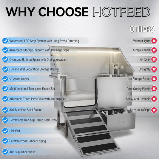 50'' Dog Washing Station - 304 Stainless Steel, LED Dog Bathing Station with Ramp, 2 Drawer, Floor Grate & Lick Pad for Large, Medium & Small Dogs