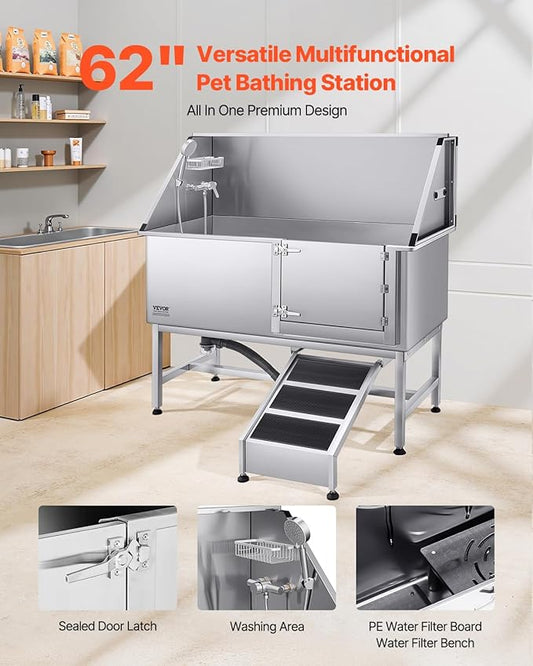 VEVOR Stainless Steel Dog Washing Station, Professional 62 inch Pet Grooming Tub w/Ramp, PE Water Filter Board, Faucet & Showerhead & Soap Holder Bathtub for Large & Medium & Small Pets (Right Door)