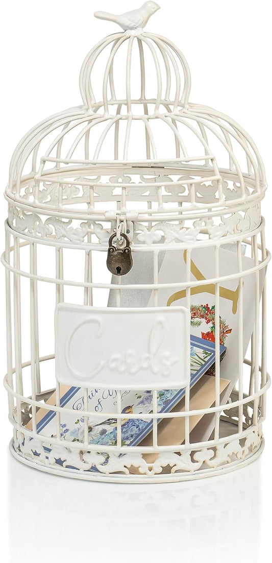 Red Co. 9.5” Dia Round Decorative Rustic Lockable Metal Birdcage Wedding Card Holder, White