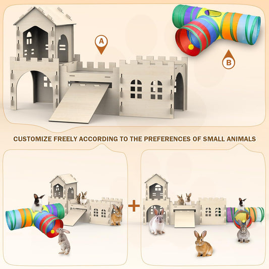 Large Bunny House and Hideouts, Wooden Dual-Layer Rabbit Castle with Stair, Rubber Band-Free Setup - Chew-Proof, Sturdy Habitat for Guinea Pig Chinchilla Ferret (Rabbit House with Tunnels & Tubes)