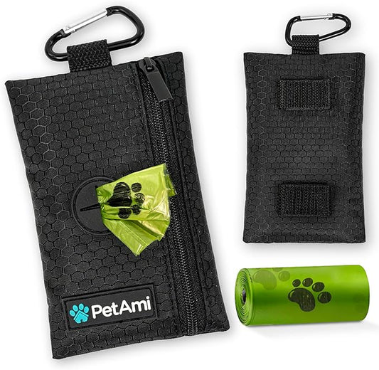 PetAmi Dog Poop Bag Holder for Leash, Dog Poop Bag Dispenser with Clip, Dog Waste Bag Holder for Pet, Dog Treat Pouch, Doggy Walking Camping Accessories with Trash Bag Roll, Black 1 Pack